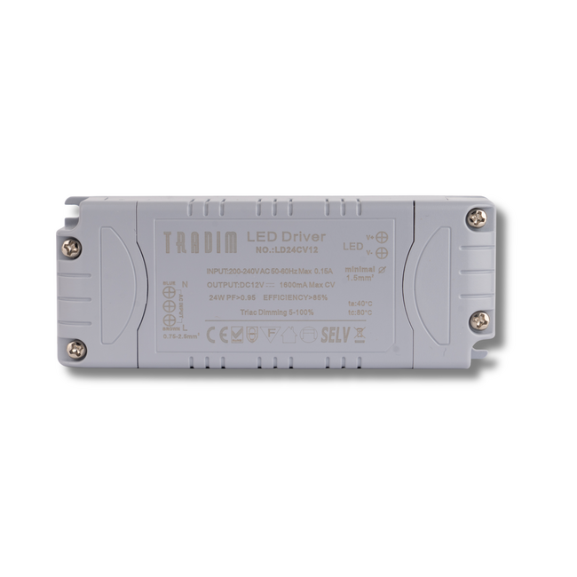 Dieser Tradim-Konstantspannungs-LED-Treiber eignet sich für die Ansteuerung von 12V-LED-Lampen und ist in verschiedenen Wattagen erhältlich, nämlich 24, 48 und 60 W/VA. Die Größe des Treibers hängt von der Wattzahl ab. Dieser Treibertyp ist mit R,C-Dimmern triac-dimmbar.